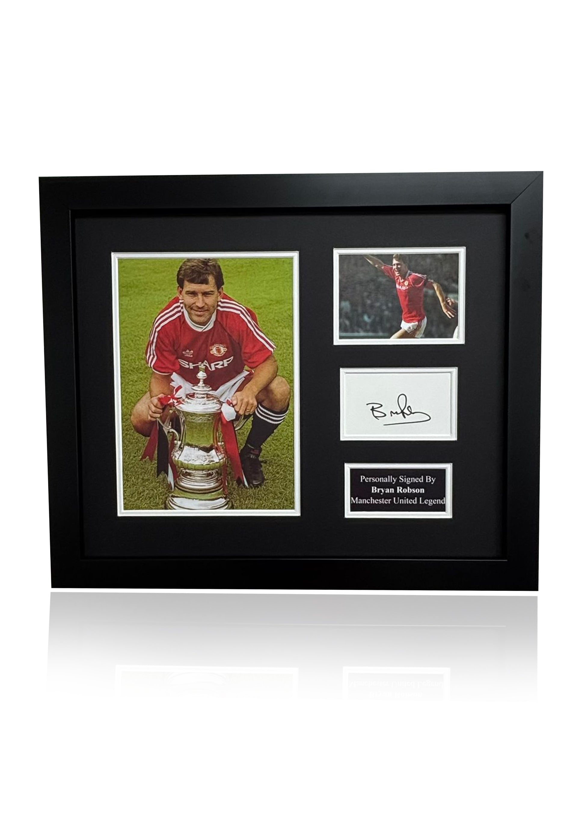 Genuine hand signed photo card montage by Manchester United Legend Bryan Robson football memorabilia MUFC