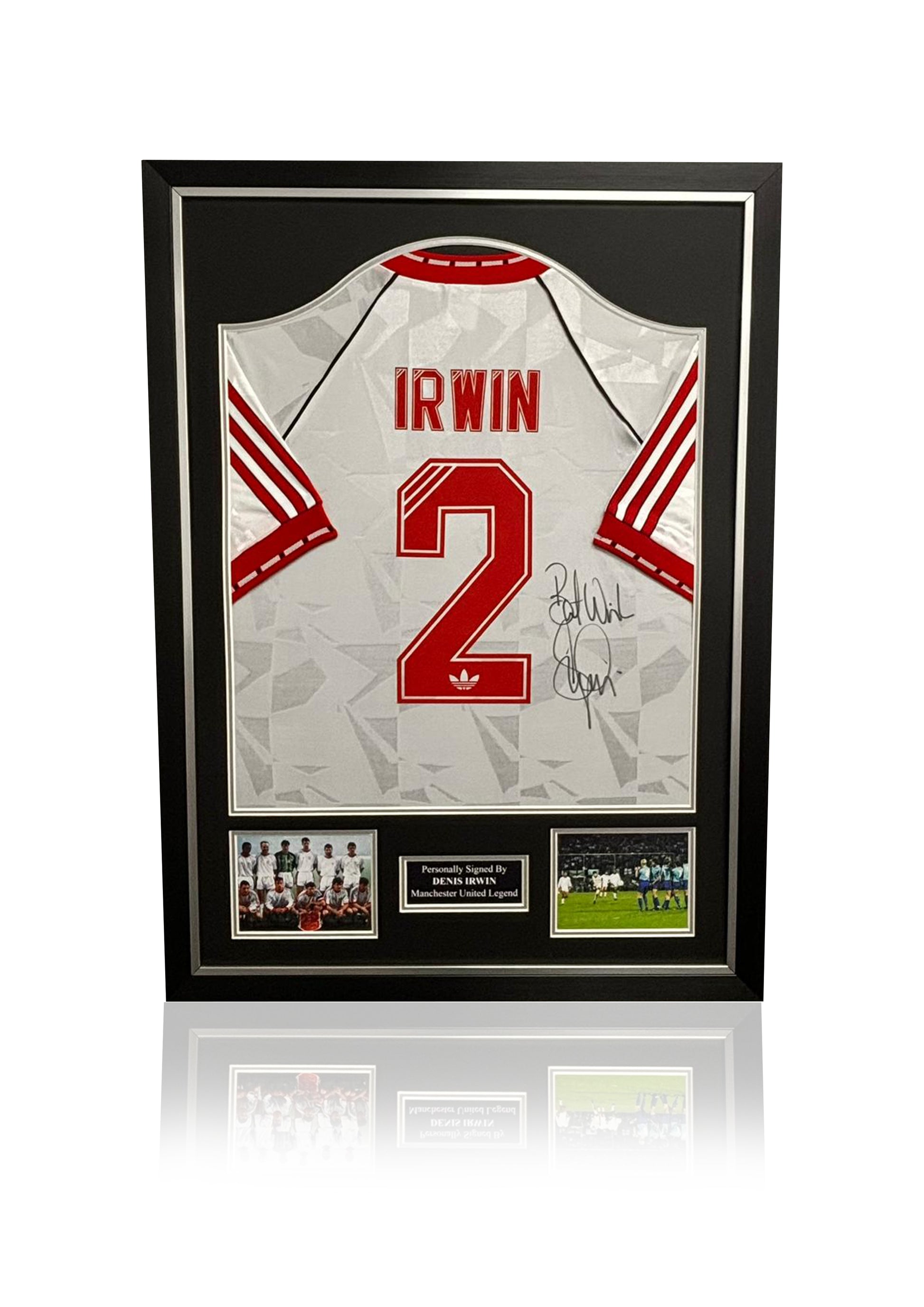 Denis Irwin Manchester United 1991 hand signed framed CWC Cup Winners Cup sleeves on show away shirt
